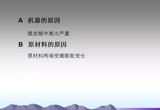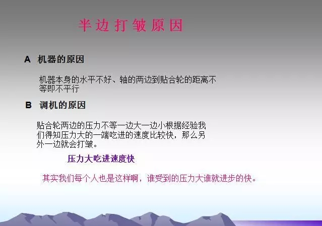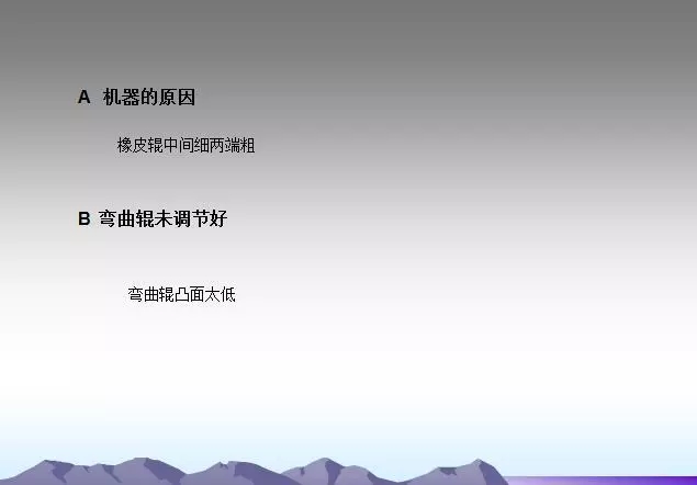 背輥及各過輥粘有異物或使用過多的水。需要經(jīng)常檢查,及時(shí)發(fā)現(xiàn)并清理,并注意不要損傷輥面。